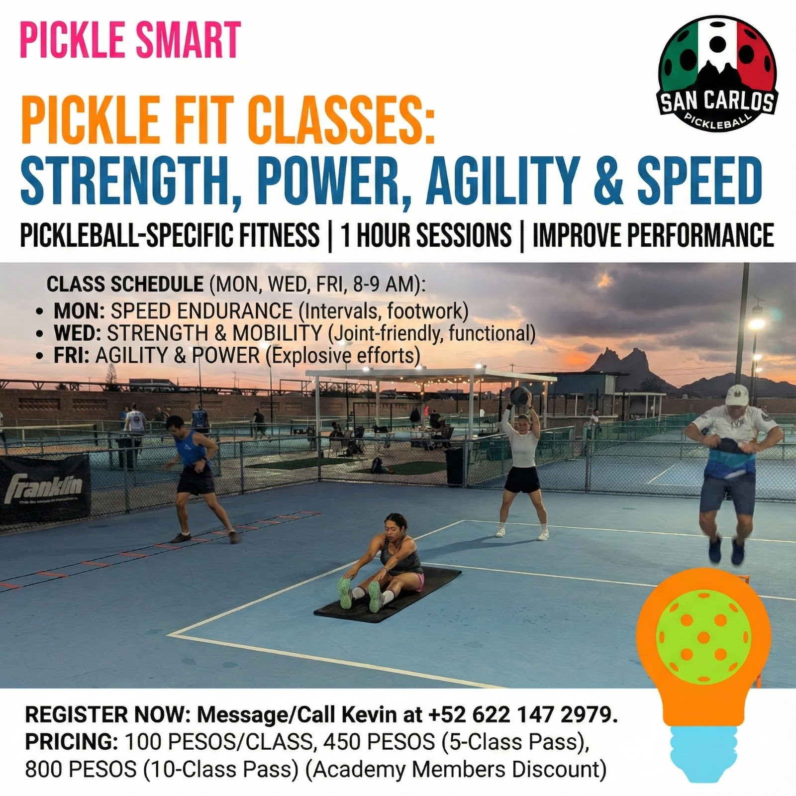 New This Year: Pickle Fit Classes! designed to improve your pickleball-specific fitness, focusing on strength, power, agility, and speed. With regular training, you can expect faster reaction time, better court coverage, increased endurance, and fewer aches and pains. These classes will help you improve your health, spend more time on the court, compete at a higher level, and enjoy the sport you love even more.