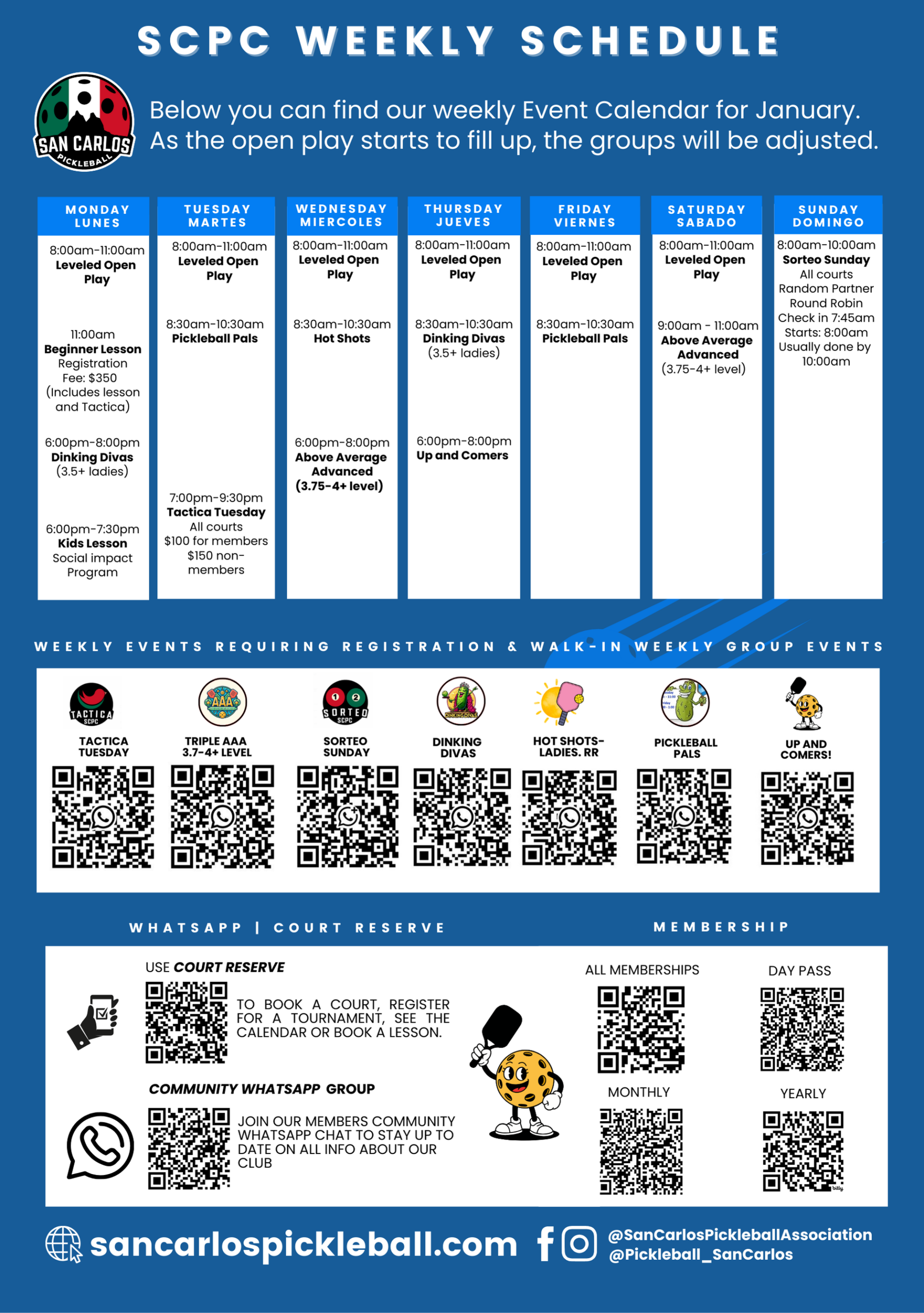 - Sorteo Sundays – Sundays at 8:00am (be there by 7:45am). First come – first served for all skills levels, limited to 70 people. Free to members.