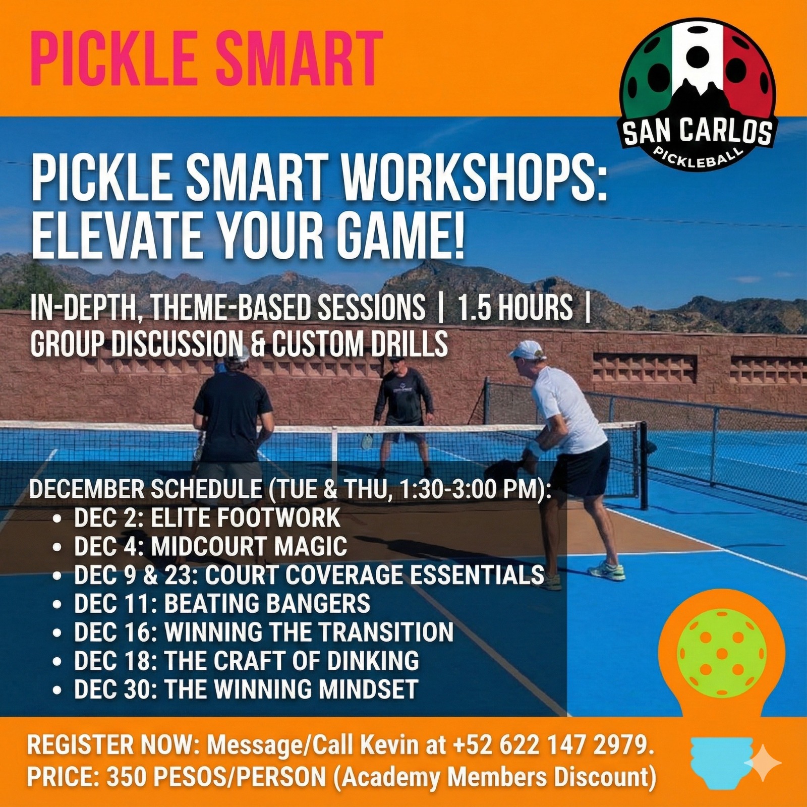 To register for a workshop, please message (WhatsApp, text) or call Kevin at +52 622 147 2979. The price is 350 pesos per person (Pickle Smart Academy members receive a discount).